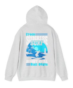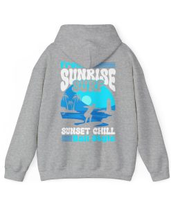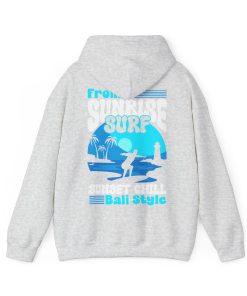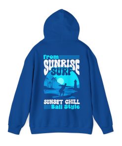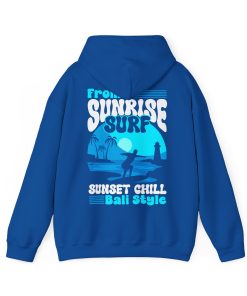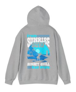 This hoodie featuring a sunrise surfing design is perfect for those who love the beach and outdoor activities. It gives off a relaxed and adventurous vibe, making it ideal for casual wear or for a day out by the sea. It is relevant for beach lovers, surfers, and anyone who enjoys a laid-back lifestyle. This hoodie is great for holidays like the Christmas season or for everyday wear.